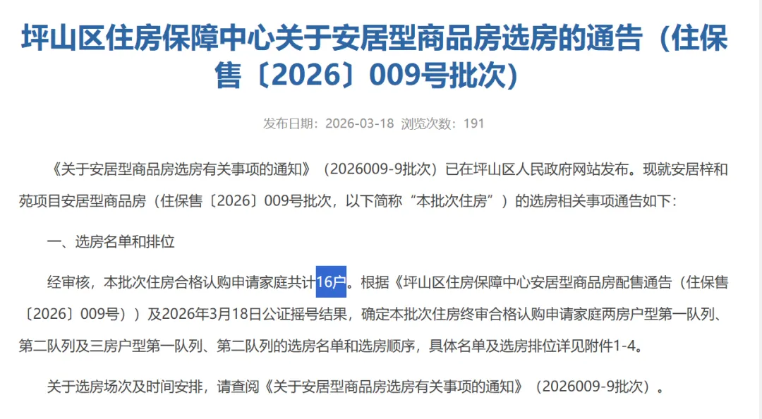 最典型的莫过于坪山区坑梓街道的安居梓和苑。作为深圳安居房史上 “最冷项目”,这个坐拥 1109 套房源、带装修均价仅 1.76 万 /㎡的大盘,2026 年 3 月最新配售批次交出了惊人数据:744 套两房户型仅 13 户家庭申购,356 套三房户型更是只有 3 户问津,最终有效申购数仅 16 户,认购率低至1.45%,相当于 1 户买家能挑 69 套房源,楼层朝向随意选。回溯 2026 年 1 月第一轮申购,更是只有 5 户提交申请,最终仅 1 户签约,冷清程度刷新纪录。