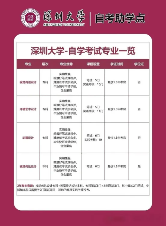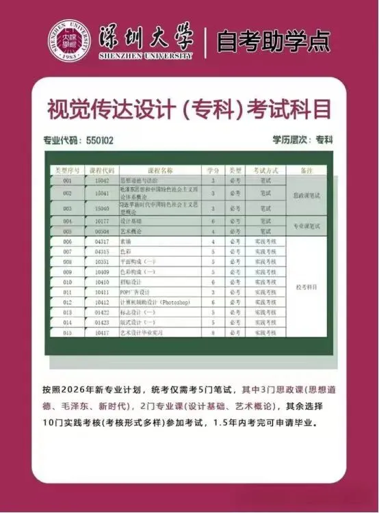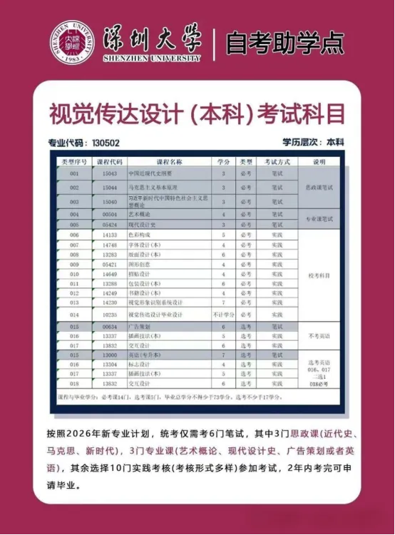 按照2026年新专业计划,统考仅需考5门笔试统考,其中思政课(思想道德,毛泽东,新时代),专业课(艺术概论、设计基础);其余10门实践考核(考核形式多样)。对比大自考,该专业难度低,毕业周期短(1.5年考完可申请毕业),不限制前置学历。专本科套读(均为视觉传达设计专业):1门思政课(新时代思想)、1门专业课(艺术概论)考一次即可。