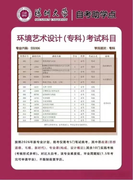 👉按照2026年新专业计划,统考仅需考5门笔试统考,其中思政课(思想道德,毛概,新时代),专业课(构成、设计概论);其余10门实践考核(考核形式多样)。对比大自考,该专业难度低,毕业周期短(1.5年考完可申请毕业),不限制前置学历。