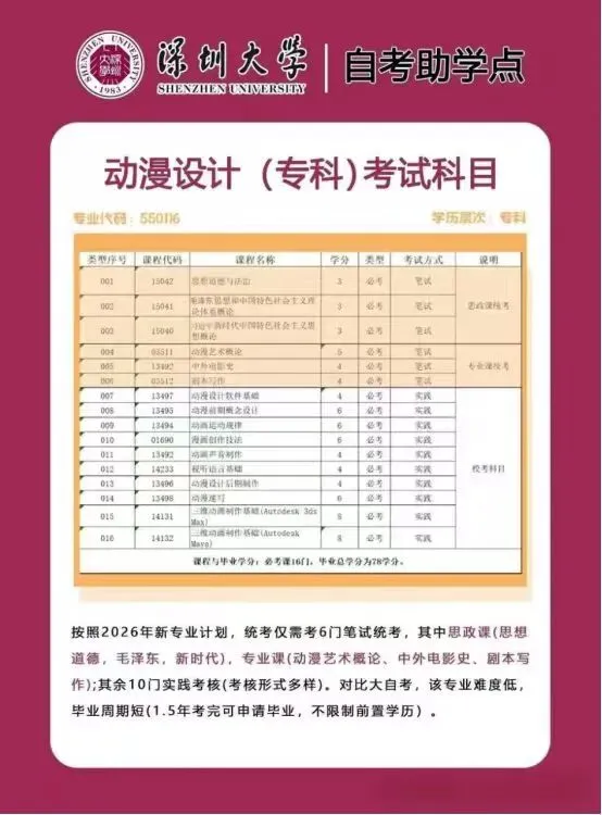 按照2026年新专业计划,统考仅需考6门笔试统考,其中思政课(思想道德,毛泽东,新时代),专业课(动漫艺术概论、中外电影史、剧本写作);其余10门实践考核(考核形式多样)。对比大自考,该专业难度低,毕业周期短(1.5年考完可申请毕不限制前置学历。