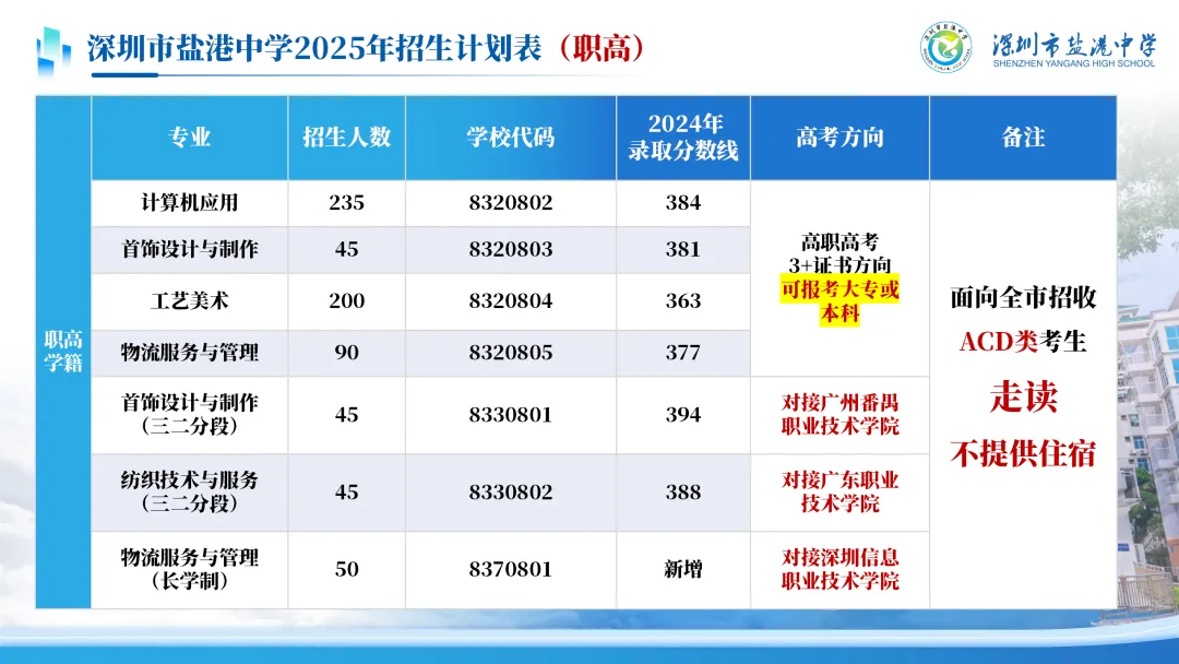 学生可通过3+证书考取职业本科、深职大等知名院校。2021-2024年共8人被本科院校录取。2024年首次与深圳信息职业技术学院现代物流专业实行“三二分段”模式合作办学;2025年将与深圳信息职业技术学院推行“中高企协同长学制人才培养”,学生不用参加高考就能晋升高职院。