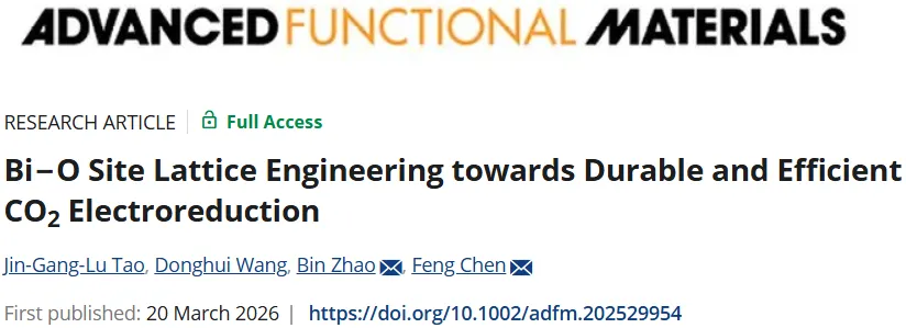 为了应对这些挑战,2026年03月20日,华东理工大学陈锋团队在Advanced Functional Materials期刊发表题为“Bi-O Site Lattice Engineering towards Durable and Efficient CO2 Electroreduction”的研究论文,团队成员Tao Jin-Gang-Lu为论文第一作者,陈锋、深圳大学赵斌为论文共同通讯作者。