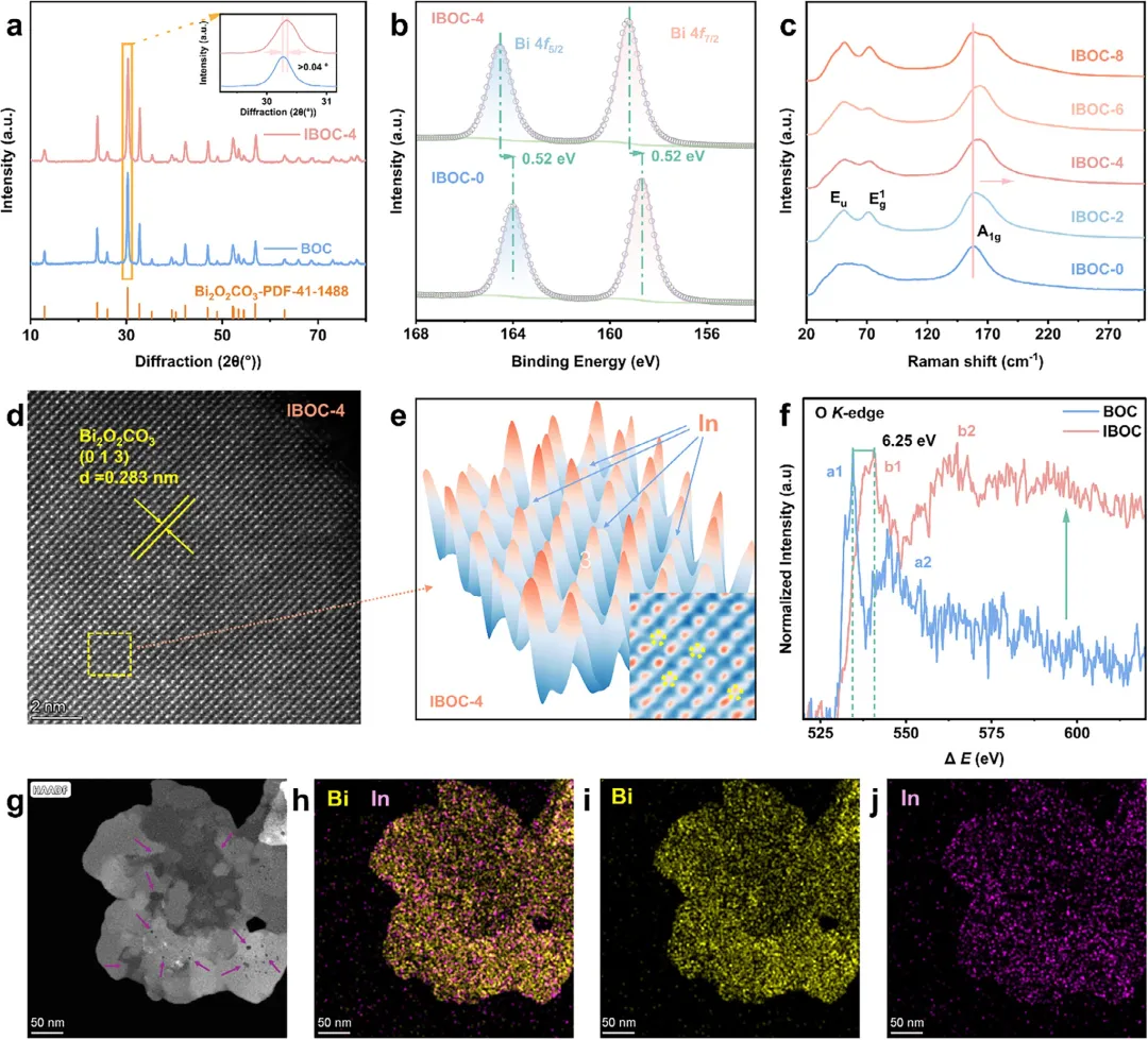 图1 | (a) IBOC-4和BOC的XRD图谱。(b) IBOC-4和BOC的高分辨Bi 4f XPS谱图。(c) BOC和IBOC-X的拉曼光谱。(d) IBOC-4的图像。(e) (d)中选定区域对应的三维原子重叠高斯函数拟合图。(f) IBOC-4和BOC处O K边的EELS谱图信号。(g) IBOC-4的HADDF-STEM图像,紫色箭头指示表面晶格缺陷,以及(h-j)相应的EDX元素分布图。