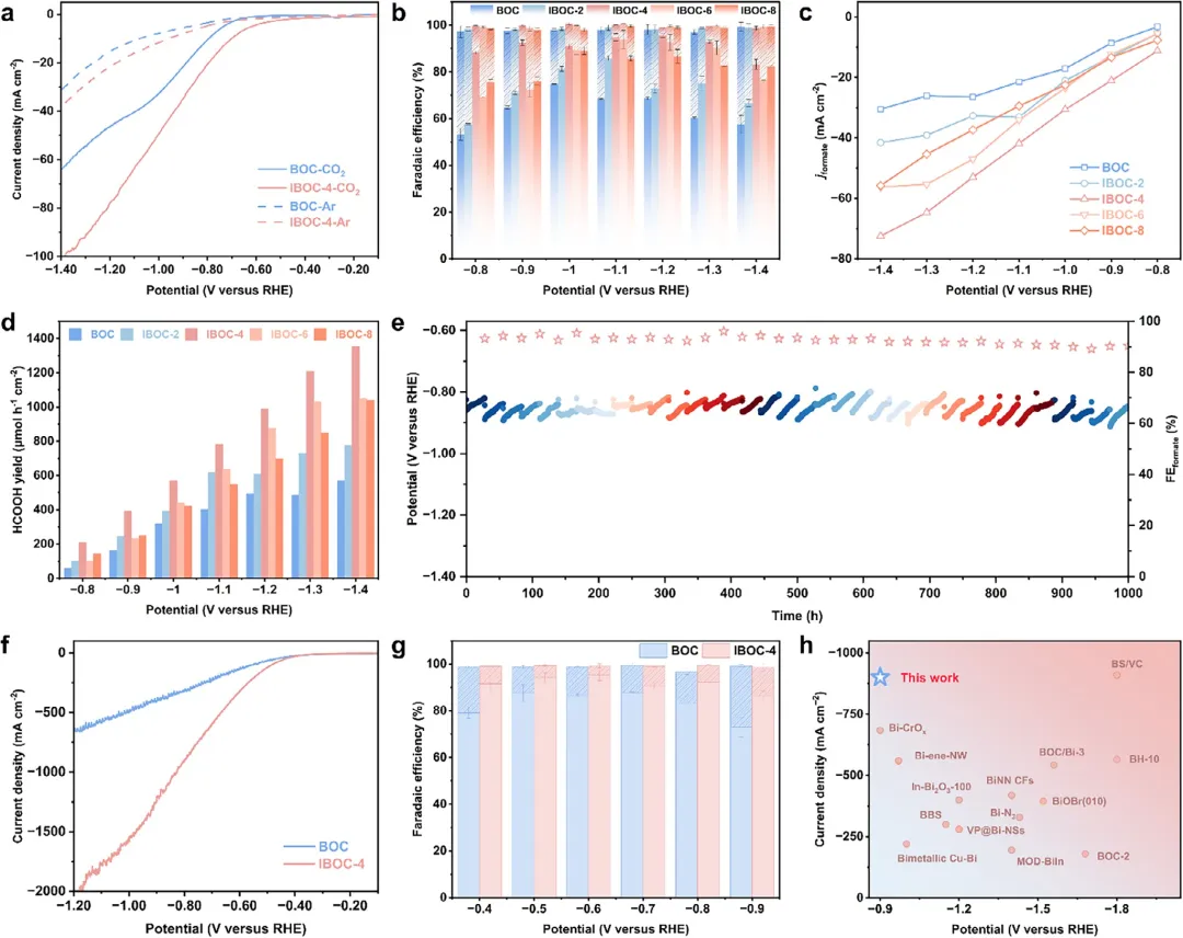图2 | (a) IBOC-4在CO₂和Ar饱和的0.5 M KHCO₃中的LSV曲线。(b) IBOC-4在不同电位下的产物法拉第效率。(c) BOC和IBOC-X的甲酸盐分电流密度。(d) BOC和IBOC-X在-1.4 V下的甲酸盐产率。(e) IBOC-4在-20 mA cm⁻²下的长期稳定性测试。(f) 在流动池中,IBOC-4和BOC在CO₂和Ar饱和的1 M KHCO₃中的LSV曲线。(g) IBOC-4在流动池中不同电位下的产物法拉第效率。(h) IBOC-4与近期报道的用于CO₂RR生成甲酸盐的Bi基催化剂在流动池中的性能比较。