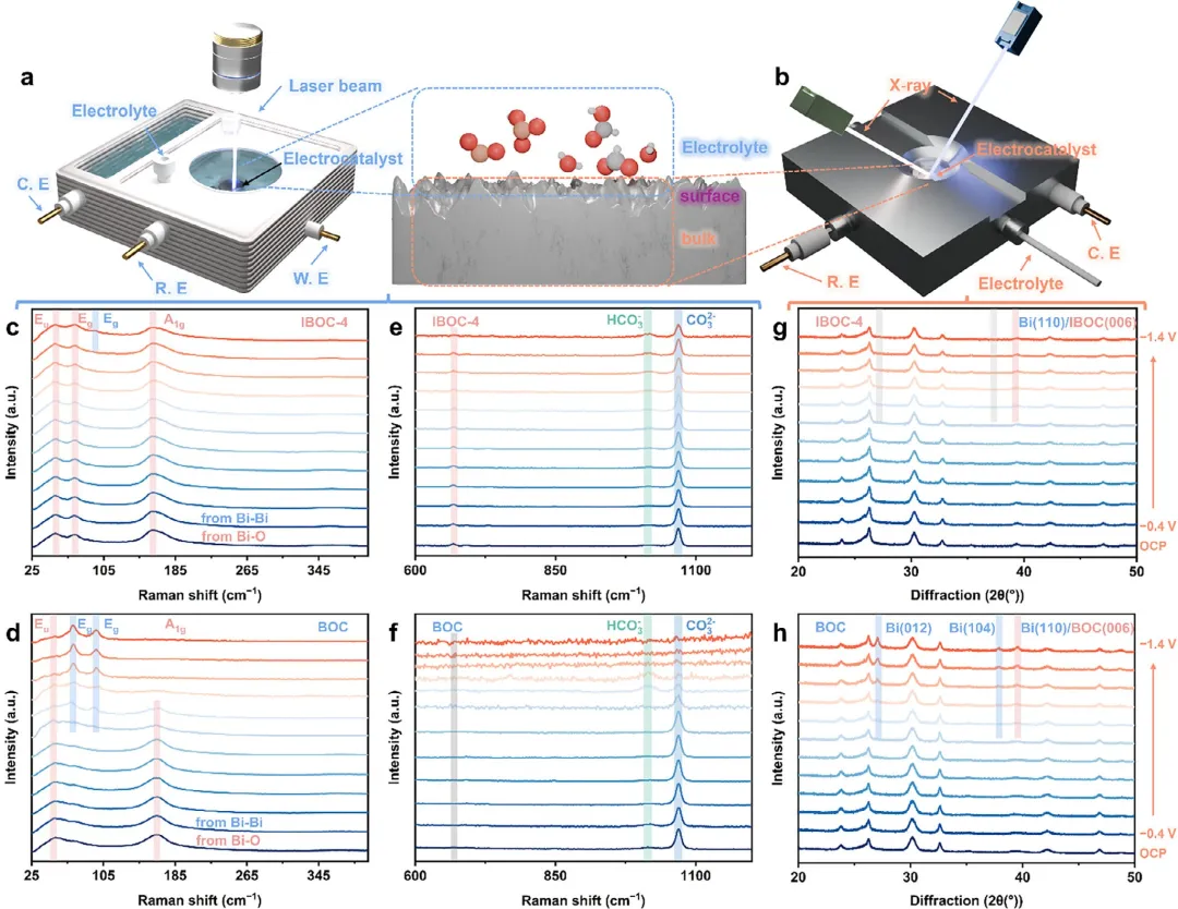 图3 | (a) 原位拉曼和(b) 原位XRD的定制电化学池示意图,其中W.E.为工作电极,R.E.为参比电极,C.E为对电极; (c, d) IBOC-4和(e, f) BOC的原位拉曼光谱以及(g) IBOC-4和(h) BOC的原位XRD图谱。