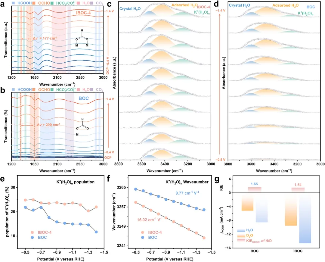 图4 | (a) IBOC-4和(b) BOC的ATR-FTIR光谱。(c) IBOC-4和(d) BOC上O-H伸缩振动带的相应解卷积结果。晶格水(蓝色)、吸附水(黄色)和K⁺(H₂O)ₙ(绿色)。(e) K⁺(H₂O)ₙ的居群数以及(f) IBOC-4和BOC在不同施加电位下K⁺(H₂O)ₙ的O-H伸缩振动斯塔克调谐率。(g) IBOC-4和BOC在CO₂RR中的j和KIE效应。