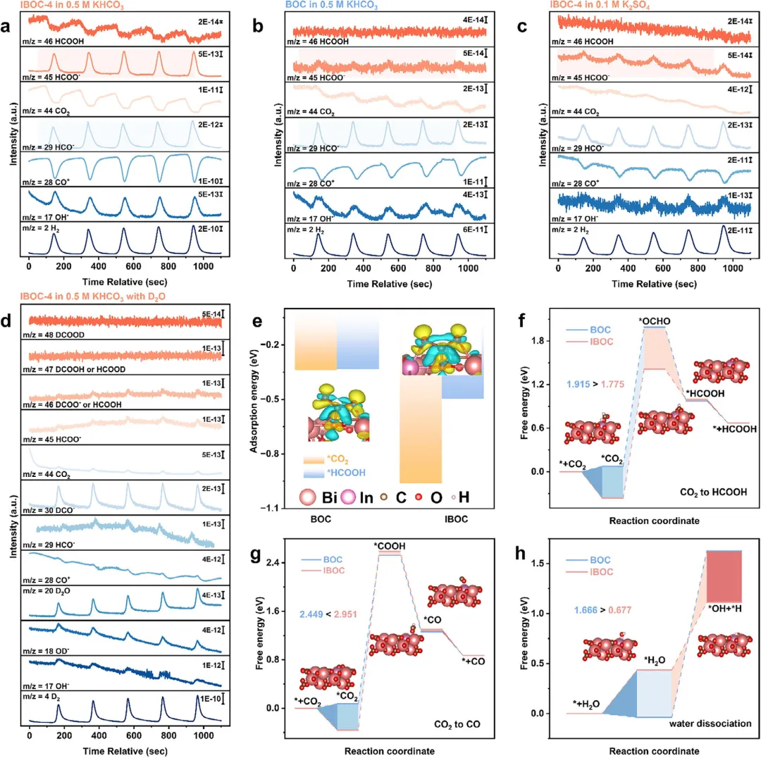 图5 | (a) IBOC-4和(b) BOC在CO₂饱和的0.5 M KHCO₃中的在线DEMS分析,(c) IBOC-4在CO₂饱和的0.1 M K₂SO₄中的在线DEMS分析,(d) IBOC-4在用D₂O配制的CO₂饱和的0.5 M KHCO₃中的在线DEMS分析。(e) IBOC和BOC的吸附能。(f) HCOOH生成(CO₂ + H₂O + 2e⁻ → HCOO⁻ + OH⁻)、(g) CO生成(CO₂ + OH⁻ + 2e⁻ → CO + H₂O)以及(h) H₂O解离过程(H₂O →*OH +*H)在IBOC和BOC上的吉布斯自由能图。粉色、紫色、棕色、红色和白色球分别代表Bi、In、C、O和H原子。