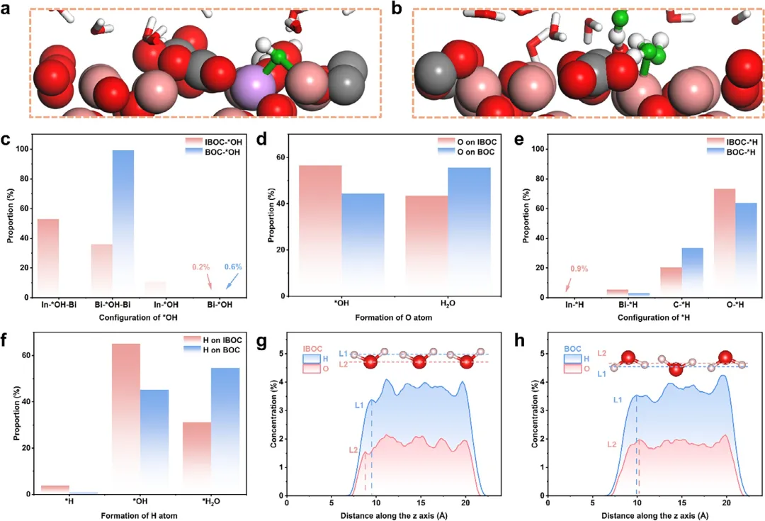 图6 | 分子动力学模拟。(a) IBOC和(b) BOC在6 ps时的AIMD模拟代表性H₂O吸附快照。粉色、紫色、灰色、红色、白色和绿色球分别代表Bi、In、C、层中的O、H和来自H₂O的O原子。(c) IBOC和BOC表面上*OH和(e) *H的构型比例。(d) IBOC和BOC表面上形成的O原子和(f) H原子的比例。(g) IBOC和(h) BOC上沿表面法线方向的H和O原子浓度分布剖面。红色和白色球分别代表O和H原子。
