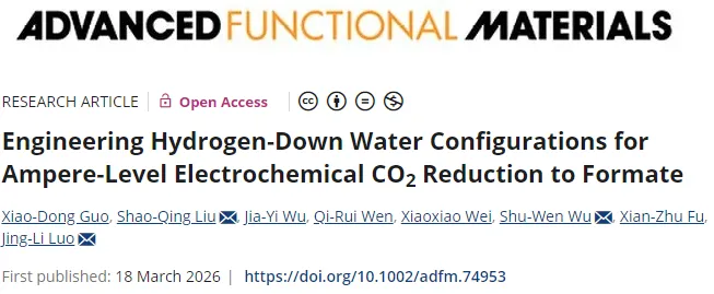 2026年3月18日,深圳大学骆静利、刘绍庆、Shu-Wen Wu团队在Advanced Functional Materials发表了标题为《Engineering Hydrogen-Down Water Configurations for Ampere-Level Electrochemical CO2 Reduction to Formate》的论文,Xiao-Dong Guo为论文第一作者,骆静利、刘绍庆、Shu-Wen Wu为论文共同通讯作者。