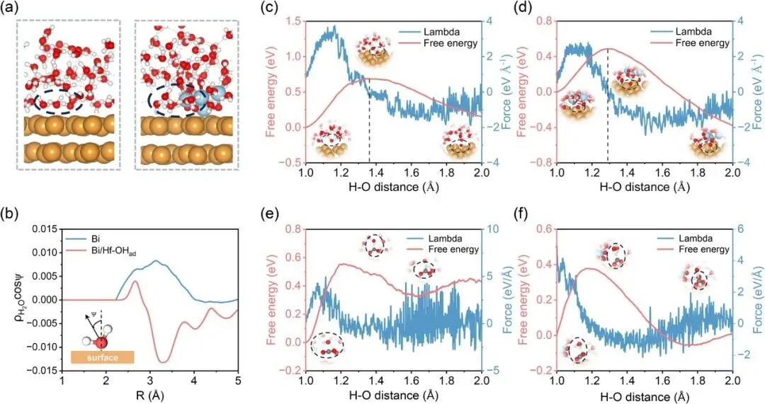 模拟结果表明,原始Bi表面的界面水分子主要采取氧向下取向,而Bi/Hf-OHad表面通过Hf-OH与水分子的氢键作用,驱动水分子重新取向为氢向下构型,偶极矩方向反转证明了该结构转变。