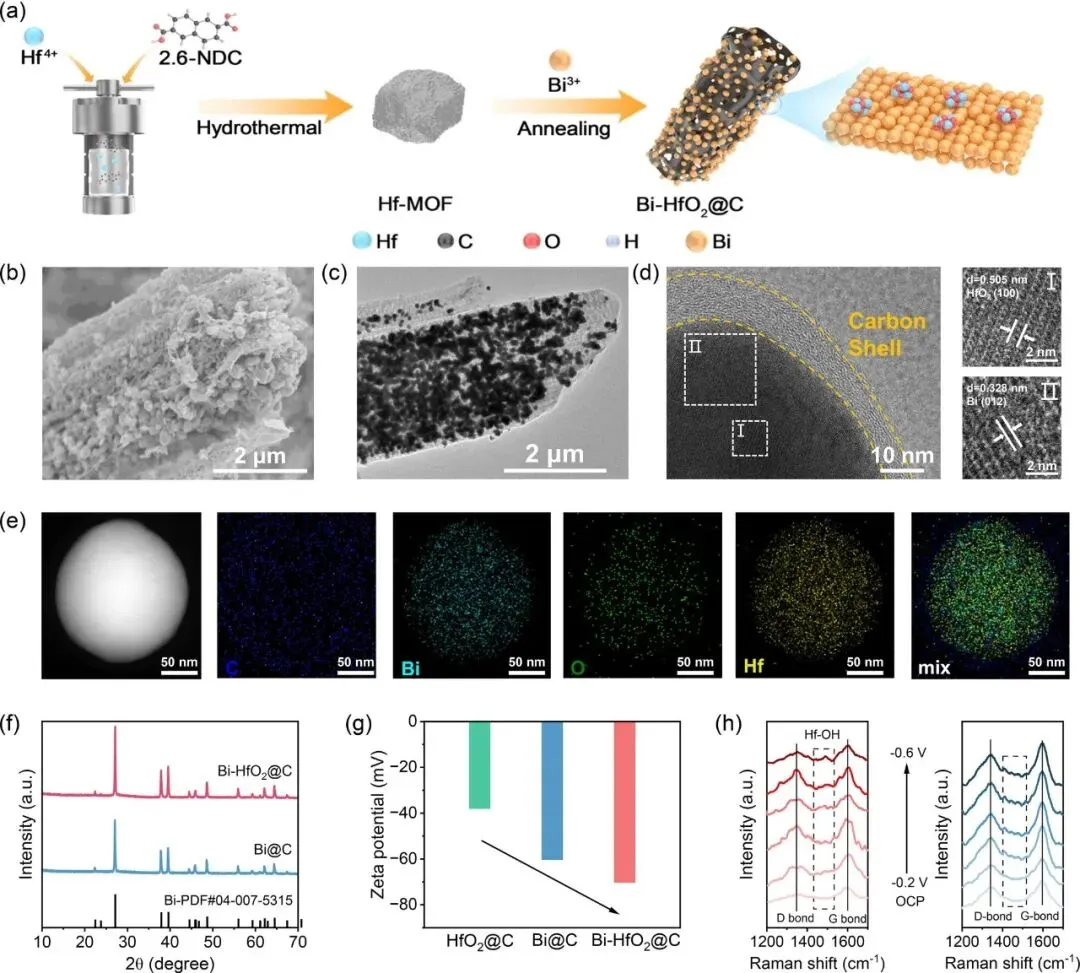 图2 | (a) Bi-HfO2@C合成流程示意图;(b) Bi-HfO2@C的SEM图像;(c) Bi-HfO2@C的TEM图像;(d) Bi-HfO2@C的HRTEM图像;(e) 对应的EDX元素 mapping;(f) Bi-HfO2@C和Bi@C的XRD图谱;(g) Bi-HfO2@C、Bi@C和HfO2@C的Zeta电位值;(h) ECR过程不同电位下Bi-HfO2@C和Bi@C的原位拉曼光谱