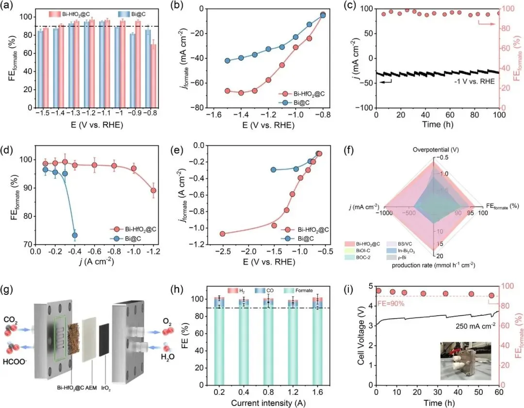 图3 | (a) 在H型电解池CO2饱和0.5 M KHCO3溶液中Bi-HfO2@C和Bi@C的甲酸盐法拉第效率;(b) 上述体系中Bi-HfO2@C和Bi@C的甲酸盐分电流密度;(c) Bi-HfO2@C在-1 V下的稳定性测试;(d) 在流动电解池1 M KOH溶液中Bi-HfO2@C和Bi@C的甲酸盐法拉第效率;(e) 上述体系中Bi-HfO2@C和Bi@C的甲酸盐分电流密度;(f) Bi-HfO2@C与近期已报道铋基催化剂的电流、过电位(200 mA cm-2下)、甲酸盐法拉第效率和产率对比;(g) 采用阴离子交换膜电解槽的MEA结构示意图(2×2 cm2);(h) MEA电解槽中1 M KOH溶液不同施加电流下的法拉第效率;(i) Bi-HfO2@C在MEA电解槽中的长期稳定性测试