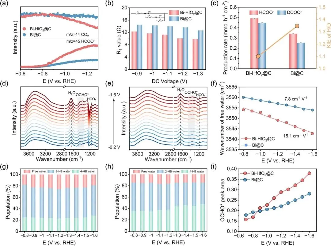 图4 | (a) ECR制甲酸盐过程中Bi-HfO2@C和Bi@C的在线DEMS分析;(b) 由Nyquist图推导得到,不同直流电压下Bi-HfO2@C与Bi@C在1 M Ar饱和KOH中的R1值对比;(c) -1.1 V vs RHE下由甲酸盐生成速率推导得到Bi-HfO2@C和Bi@C的H/D动力学同位素效应;不同电位下在CO2饱和0.5 M KHCO3溶液中记录的原位ATR-SEIRAS光谱,分别在(d) Bi-HfO2@C和(e) Bi@C表面;(f) Bi-HfO2@C和Bi@C表面自由水的O-H伸缩振动斯塔克调谐率对比;不同电位下界面水比例变化,分别在(g) Bi-HfO2@C和(h) Bi@C表面;(i) 不同电位下Bi-HfO2@C和Bi@C的OCHO*峰面积对比
