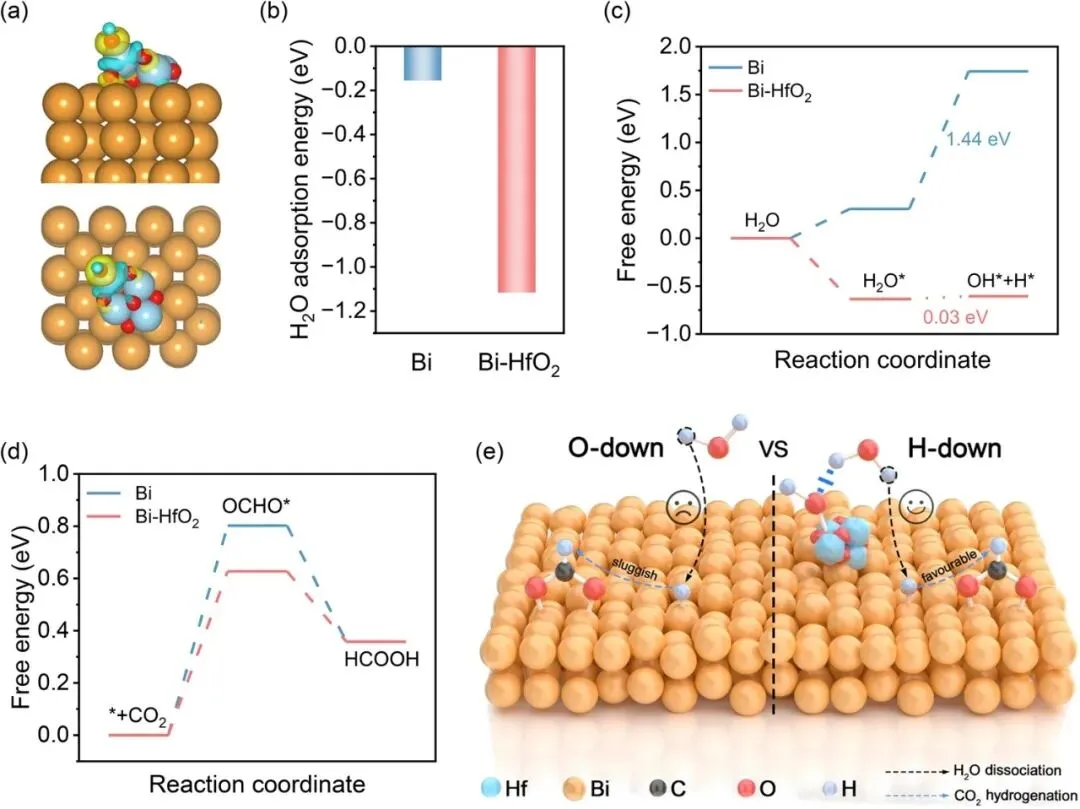 图5 | (a) 不同视角下吸附OH的Bi-HfO2的电荷密度差分图;(b) Bi和Bi-HfO2表面的H2O吸附能;(c) Bi-HfO2和Bi表面水解离过程的吉布斯自由能图;(d) Bi-HfO2和Bi表面甲酸生产的吉布斯自由能图;(e) Bi-HfO2表面氢向下水解离以及Bi表面氧向下水解离的示意图