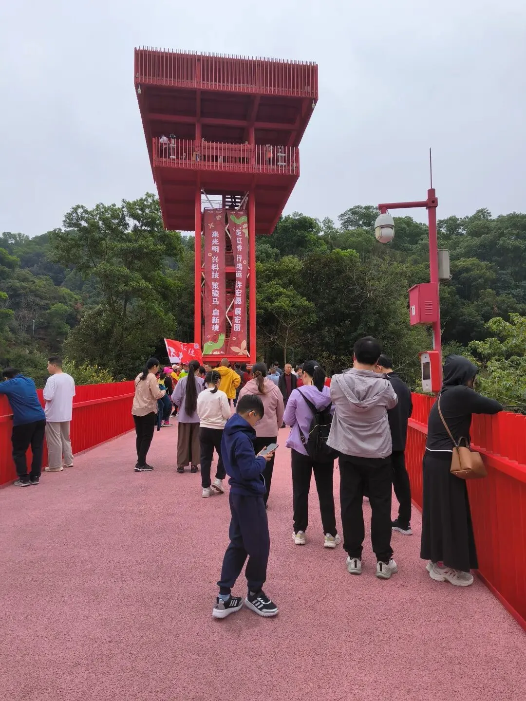 大年初一,我们和大哥一家驱车来到深圳市光明区的虹桥公园。这里有一座全长4公里、宽5米、平均高度8米的景观桥,被誉为全国第二座大跨度钢结构单柱多曲景观桥。它宛如一条红色丝带,穿梭于山林之间,漫步桥上,既能呼吸新鲜空气,又能欣赏城市与自然交融的景致。