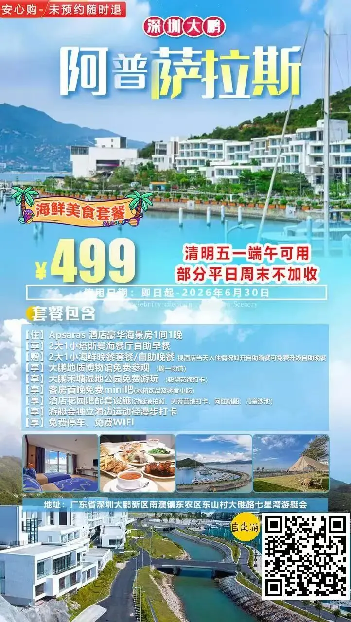 预订温馨提示:关注公众号回复【深圳大鹏七星湾阿普萨拉斯酒店】,或长按识别文中产品【海报二维码】即可购买,或点击本文左下角“阅读原文”即可进入查看产品详细信息和购买。