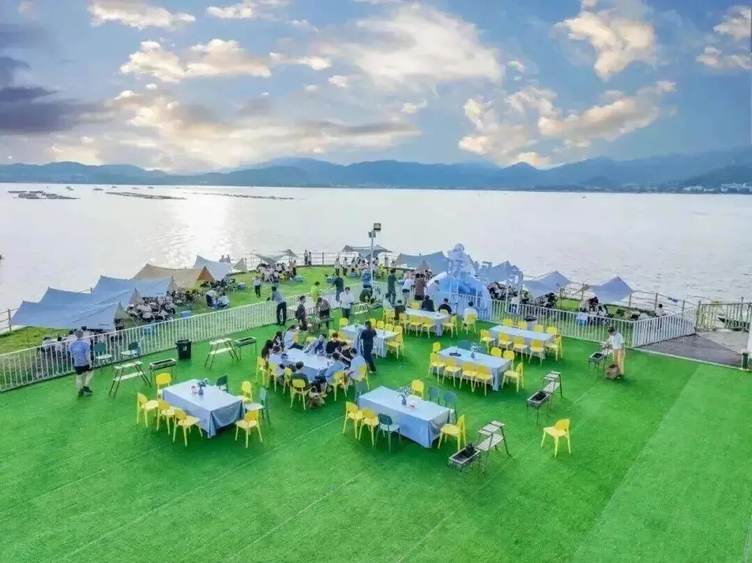 绿角草坪、白色天幕,配上一望无垠的大海