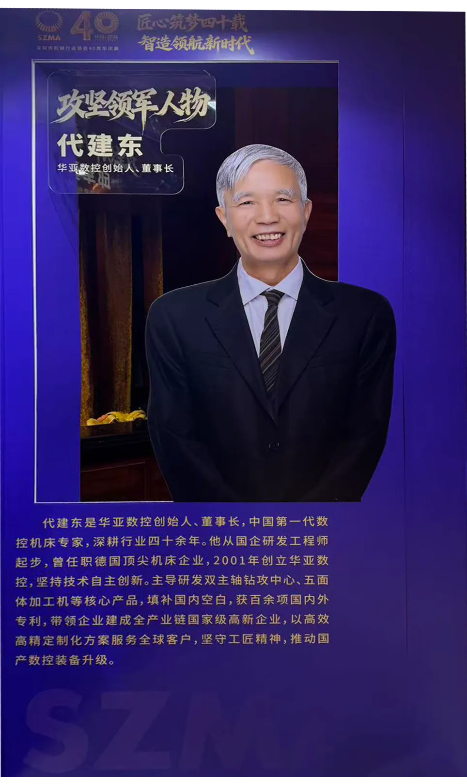 1986-2026,四十载风雨兼程,四十载匠心筑梦。3月20日,在深圳市机械行业协会成立40周年之际,一场以“匠心筑梦四十载、智造领航新时代”为主题的庆典暨九届四次会员大会隆重举行。这场盛会不仅是对深圳机械行业辉煌历程的致敬,更是一次对未来智造趋势的深度探索。在这场行业巅峰盛会上,华亚数控创始人、董事长代建东先生凭借在数控装备领域的卓越贡献与攻坚精神,荣膺“攻坚领军人物”大奖!
