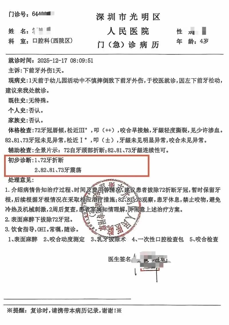 深圳市光明区人民医院病历显示,初步诊断为“1、72牙折断;2、82、81、73牙震荡”,处理意见为“建议患者拔除72折断牙冠,暂时保留牙根,后续根据牙根情况采取相应治疗措施。患者家属知情理解,并同意上述治疗方案”。