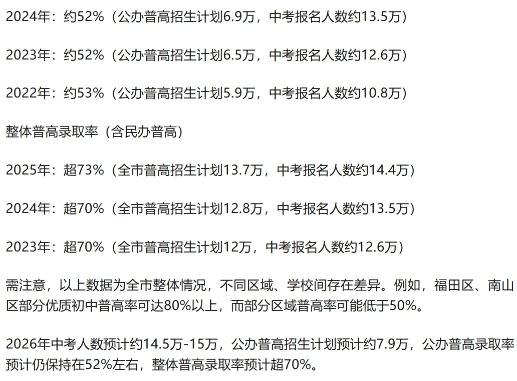根据公开信息,深圳中考升学率需区分公办普高录取率和整体普高录取率,以下是近年数据参考: