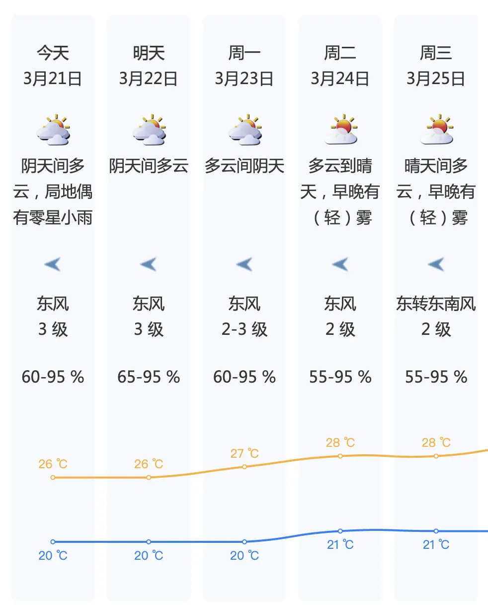 22-25日大致多云,偶有零星小雨,早晚有轻雾或雾,气温回升,渐趋温暖。