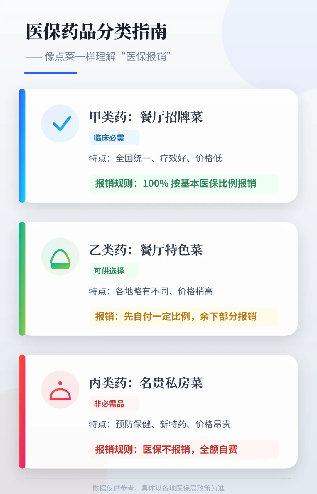 - 丙类药/自费药 👉 “豪华私房菜”完全不在医保目录内,需要自己全额买单。