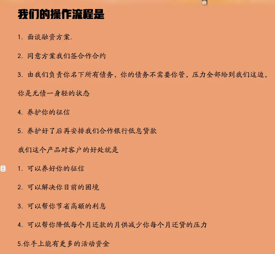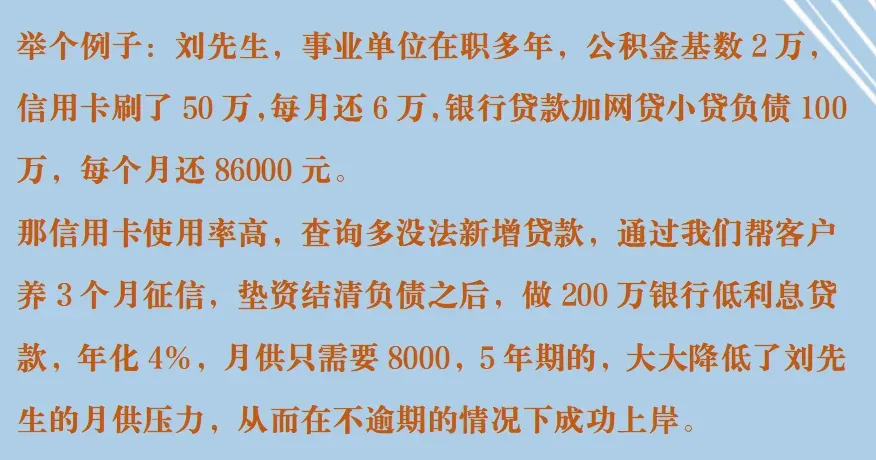 - 操作:由资金方结清您的信用卡欠款及信用贷款,保持您处于低负债甚至零负债状态,便于完成征信养护后进行贷款申请。