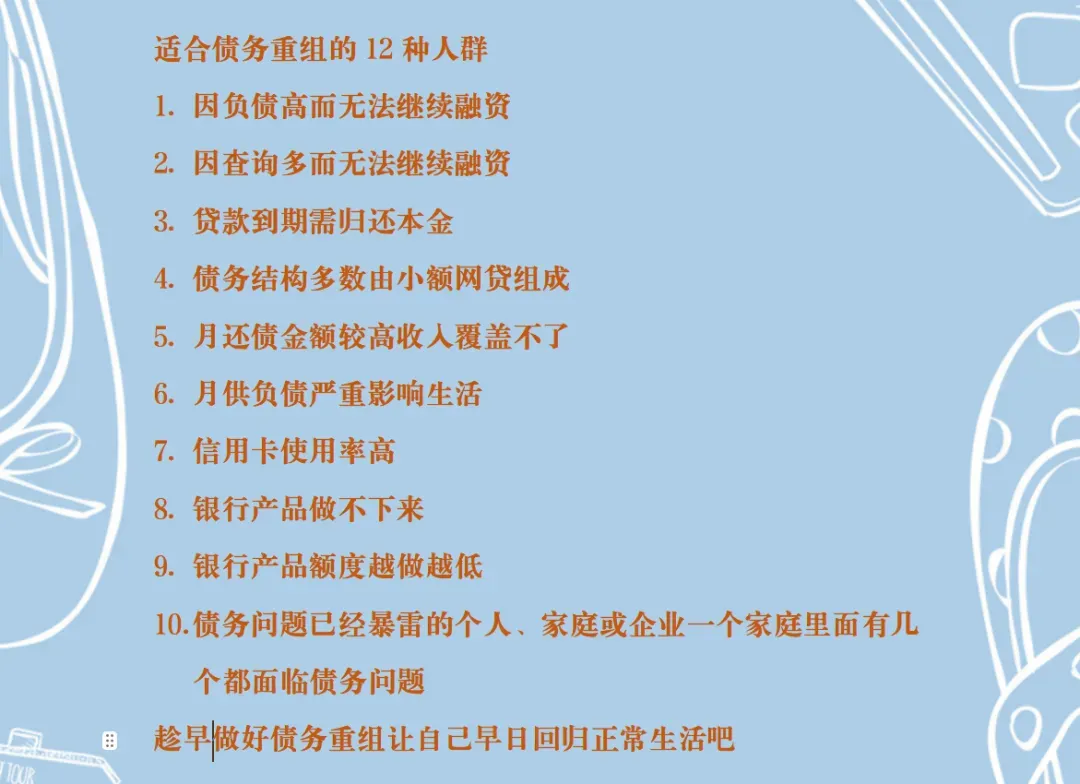 确定了这些方案要素后,您可以根据自身情况判断是否选择债务重组。想了解具体方案可添加贷老师微信详细咨询(dailaoshi6789)。