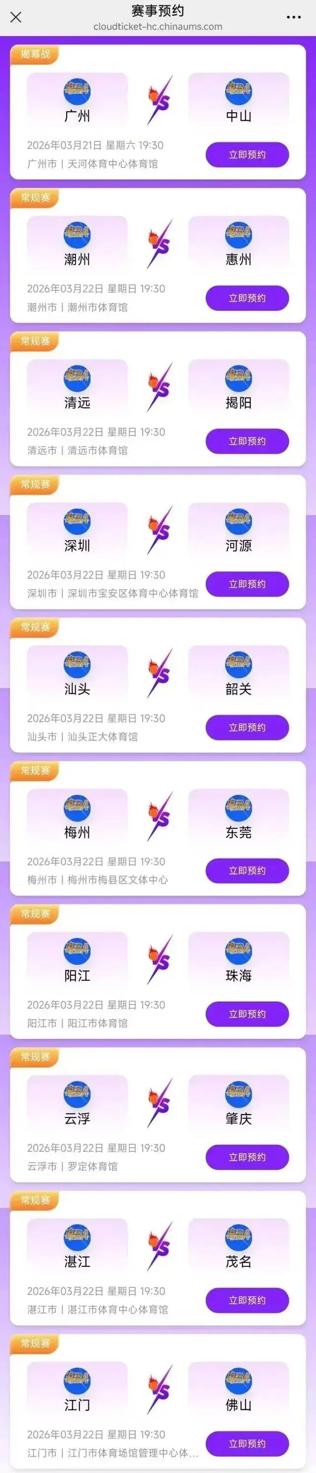首先,锁定购票平台:球迷需关注“广东篮球—粤BA”公众号,进入公众号页面后,即可找到票务预约入口,这是本次粤BA门票预约的唯一官方渠道。其次,明确预约范围与时间:目前,平台已开放3月21日至3月22日期间的10场比赛预约,其中就包括深圳男篮的粤BA首战——3月22日,深圳队将在宝安体育中心体育馆主场迎战河源队,这场焦点对决的门票也同步开启预约,球迷可按需选择场次进行预约。