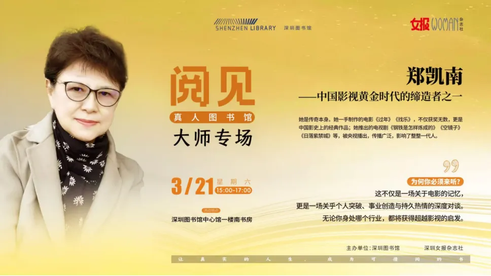 她是郑凯南,集表演、导演、编剧、策划、制片于一身,迄今为止国内实操经验最为丰富的女制片人之一。3月21日,她将把自己的影视人生、创作故事与深圳情缘,带到深圳图书馆南书房,向你娓娓道来。