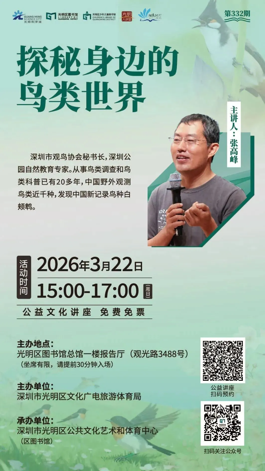 他将带我们认识那些常见却叫不上名字的鸟儿,讲述鸟类的趣味故事,科普科学爱鸟、文明护鸟的方法;同时介绍光明欢乐田园、光明湖等宝藏观鸟点,带你在日常风景里,发现藏在身边的自然之美。