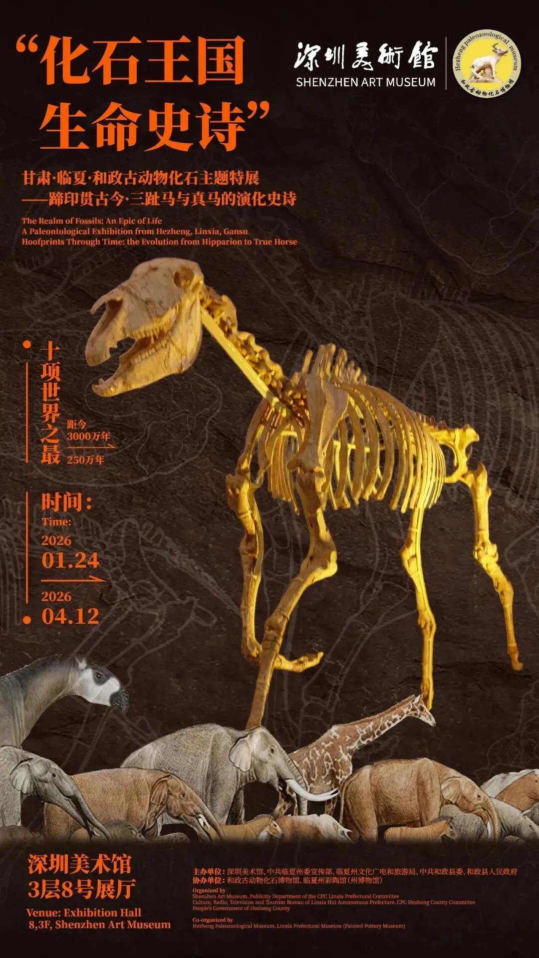 本次展览以“蹄印贯古今——三趾马与真马的演化史诗”为主题,精选和政古动物化石博物馆“十项世界之最”珍稀化石,系统展示马类从四趾到三趾再到单蹄的完整演化历程。展览融合科学叙事、生态复原与互动体验,带领观众穿越千万年时光,探寻生命演化的壮阔篇章。
