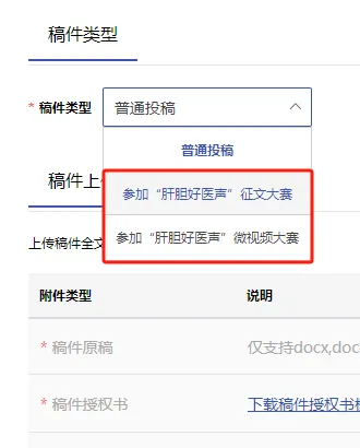 4.点击“新建投稿”,并根据提示选择参赛类型“参加‘肝胆好医声’征文大赛”,提交参赛材料。