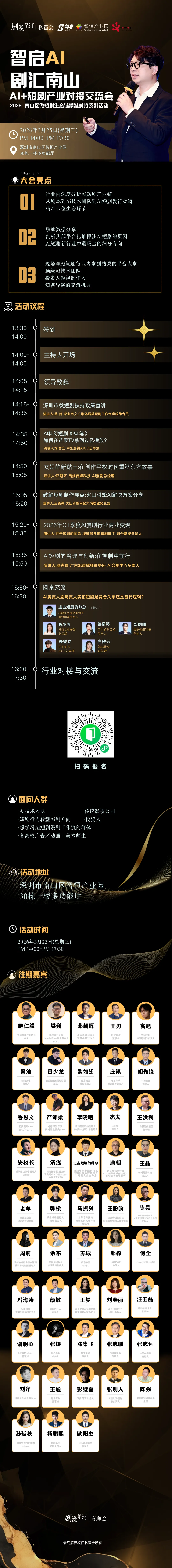 往届活动曾汇聚施仁毅、邓朝晖、那森、颜敏等行业大咖,链接数百位产业链从业者,助力众多团队打通资源壁垒、实现商业突破。本次盛会阵容升级、干货升级,更有独家政策解读与爆款案例复盘,等你来解锁!3月25日,深圳南山智恒产业园,与行业顶尖力量同行,拆解AI短剧变现密码,链接优质资源,抢占2026行业新赛道!📅 活动核心信息