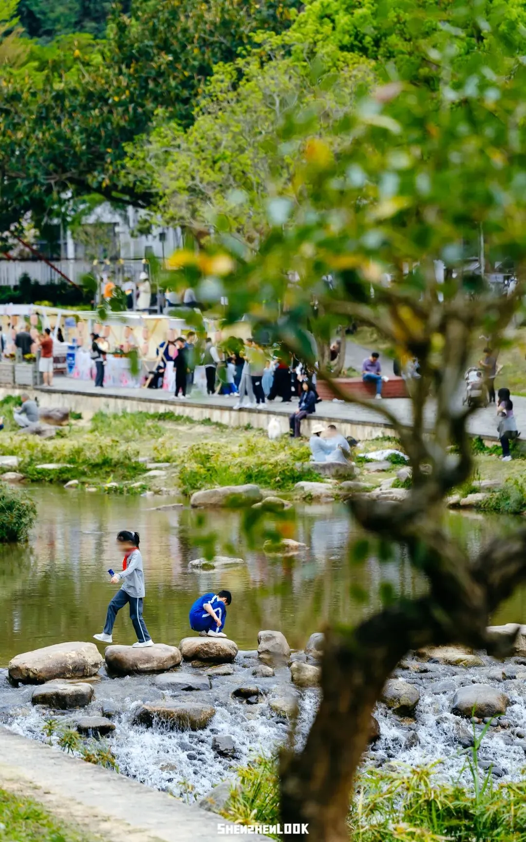 在这逛市集,根本不用担心饿肚子。市集中有多家素食品牌出席,售卖自家人气单品:舍那素坊的招牌素生煎、秘制菌菇酱;三味蔬食的凤梨腰果、蓝莓山药;慈氏海苔饭团、纯素荠菜馄饨。迎着午后清风边吃边逛,抬眼瞥见漫山的毛棉杜鹃,惬意又养眼。梧桐山河碧道全长约5公里,可徒步、可骑行。逛市集的同时,穿过一个个摊位,不知不觉也置身于碧道漫步之中了。◎ Info: