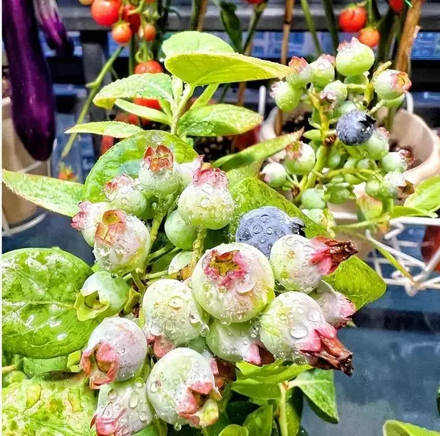 看这蓝莓,个头饱满,一个个地挤在一起,主人刚给它们喷过水,有几棵已经成熟了,好想摘下来尝尝鲜。