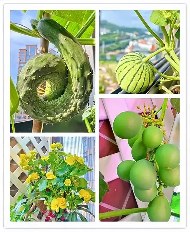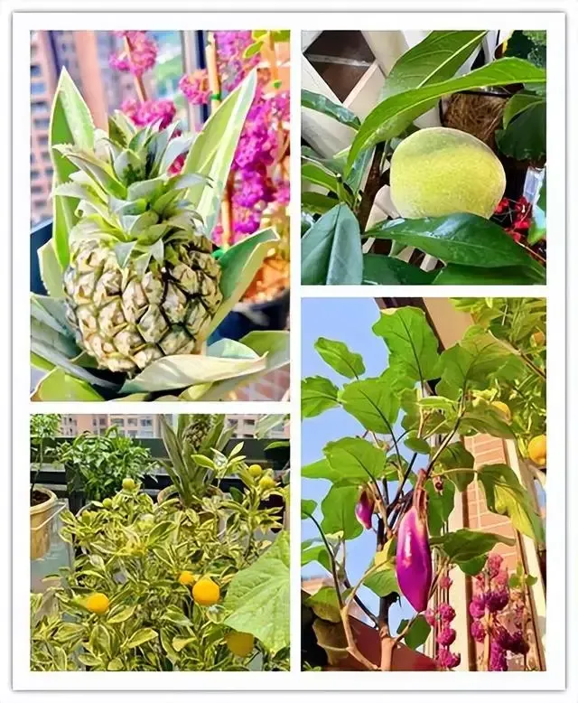 你觉得5.9平米的阳台可以种多少种瓜果,我给你细数下:菠萝、柠檬、百香果、葡萄、蓝莓、花叶小青柠、小番茄、茄子、西瓜、黄瓜、李子、桃子等十几种,大开眼界了吧。