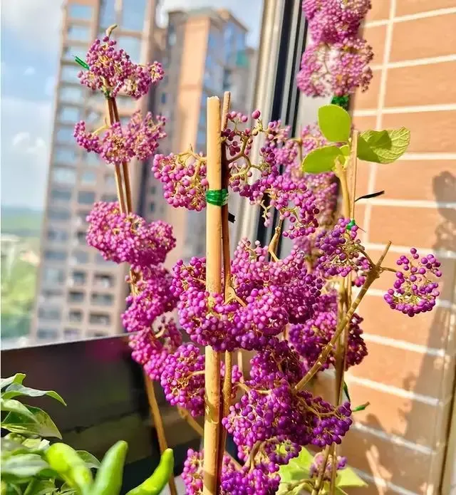 除了瓜果之外,还有不少的绿植呢。看看下面这棵紫色的植物,它叫紫珠,植株上挂满了紫色的小果子,取一粒小果子,轻轻一捏,便会爆出水珠来。