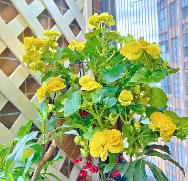 这盆开黄花的叫玫瑰海棠,也叫丽格海棠,女主说是去年才种的,到现在已经开了好几次了,花量特别大,一开就是满头花苞。