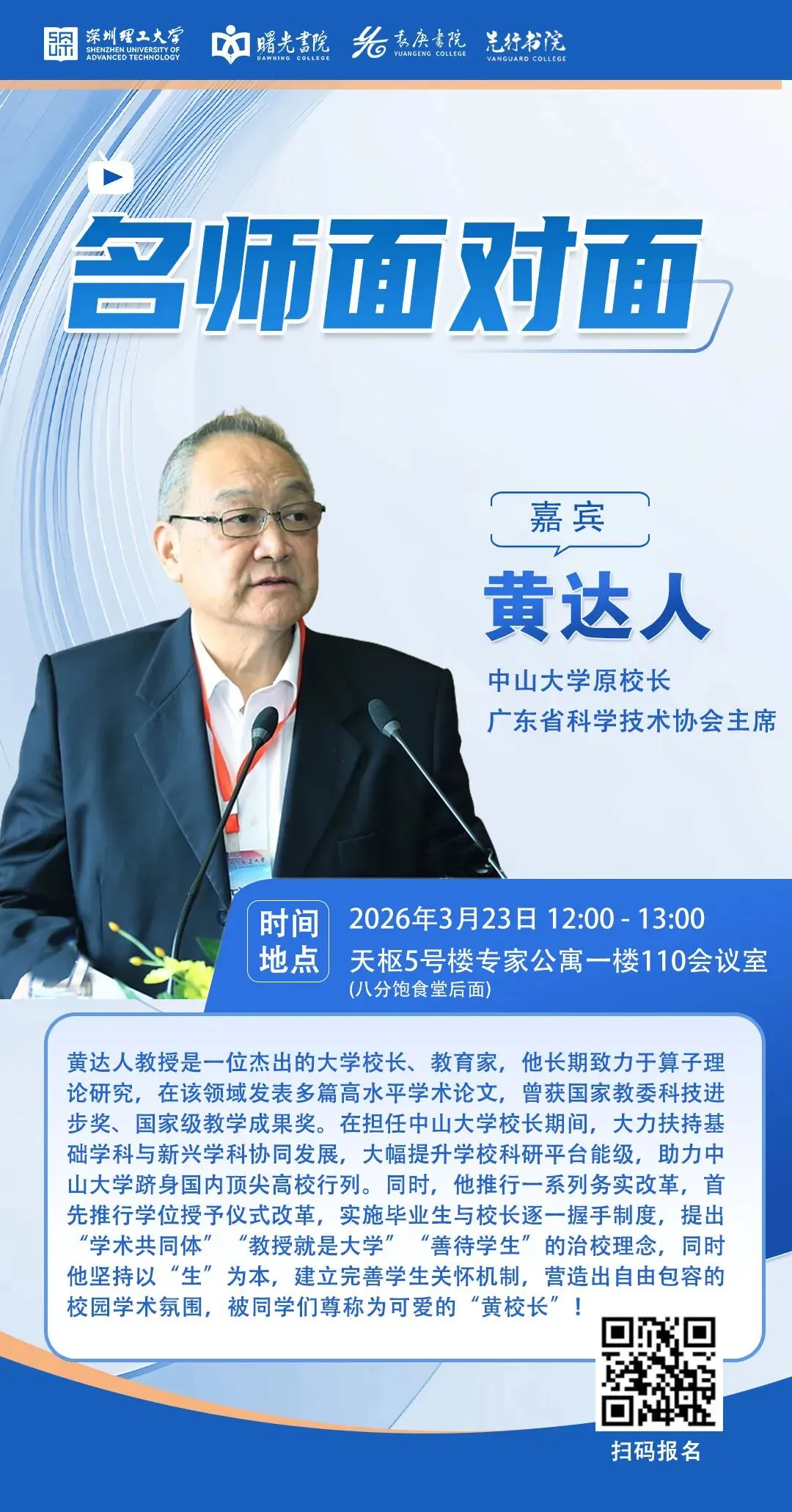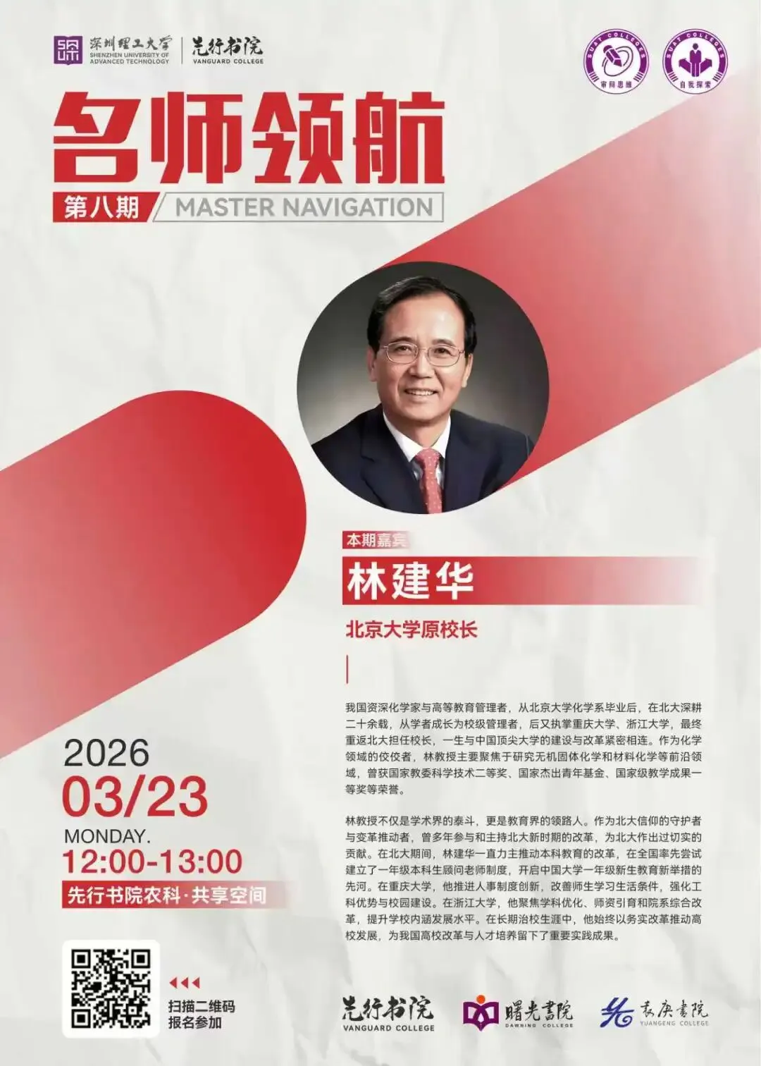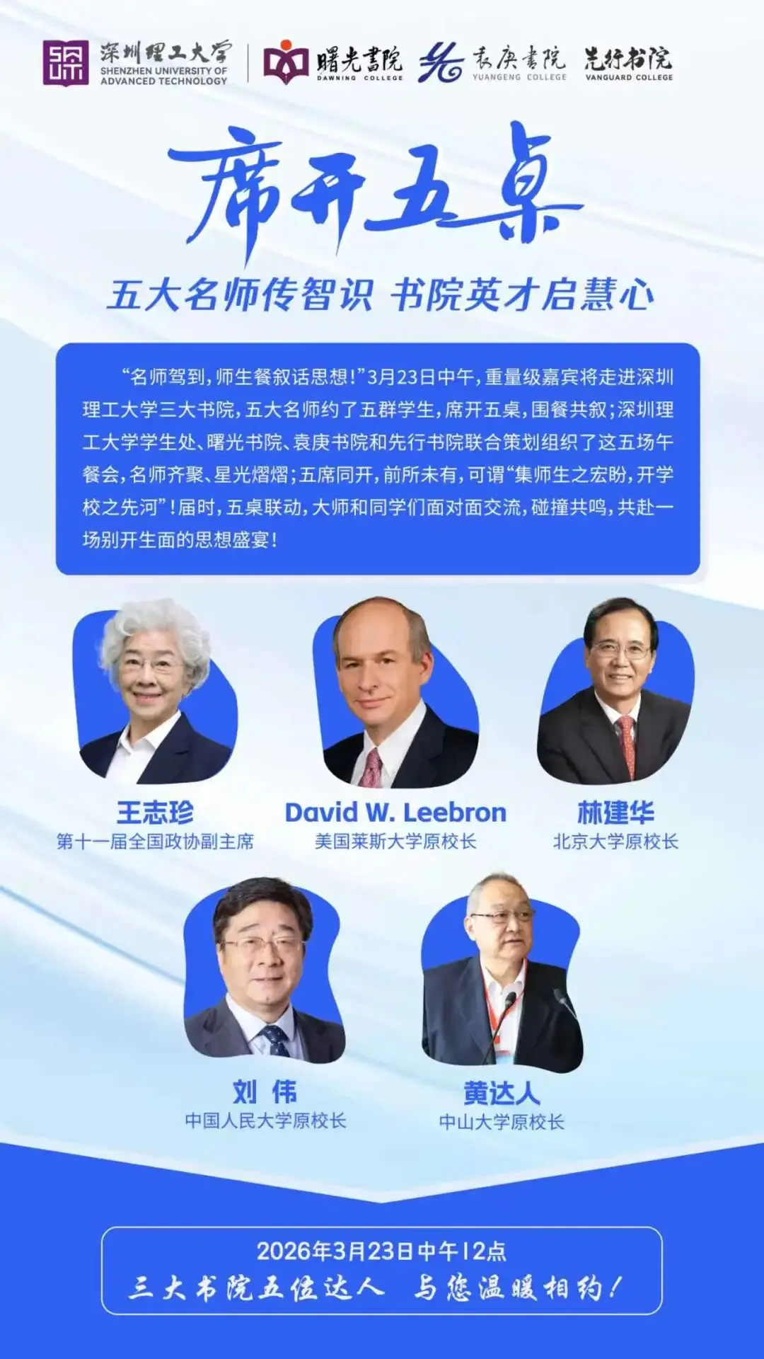 3月23日中午12点,深圳理工大学三大书院将迎来五位重磅嘉宾,前全国政协副主席和四大名校校长联袂登场,他们分别是:第十一届全国政协副主席、中国科学院院士王志珍、美国莱斯大学原校长David W. Leebron、北京大学原校长林建华、中国人民大学原校长刘伟、中山大学原校长黄达人,名师荟萃、星光熠熠。