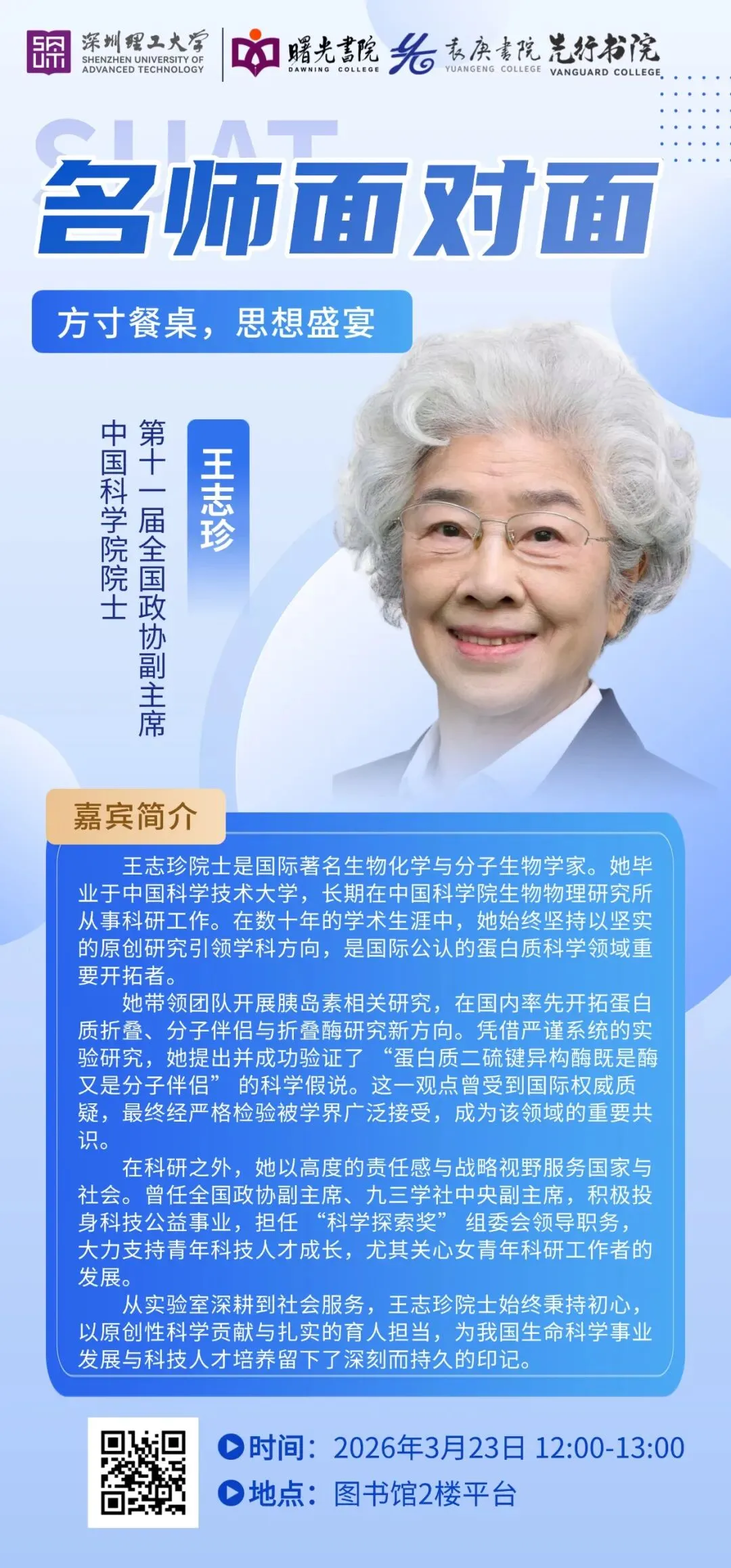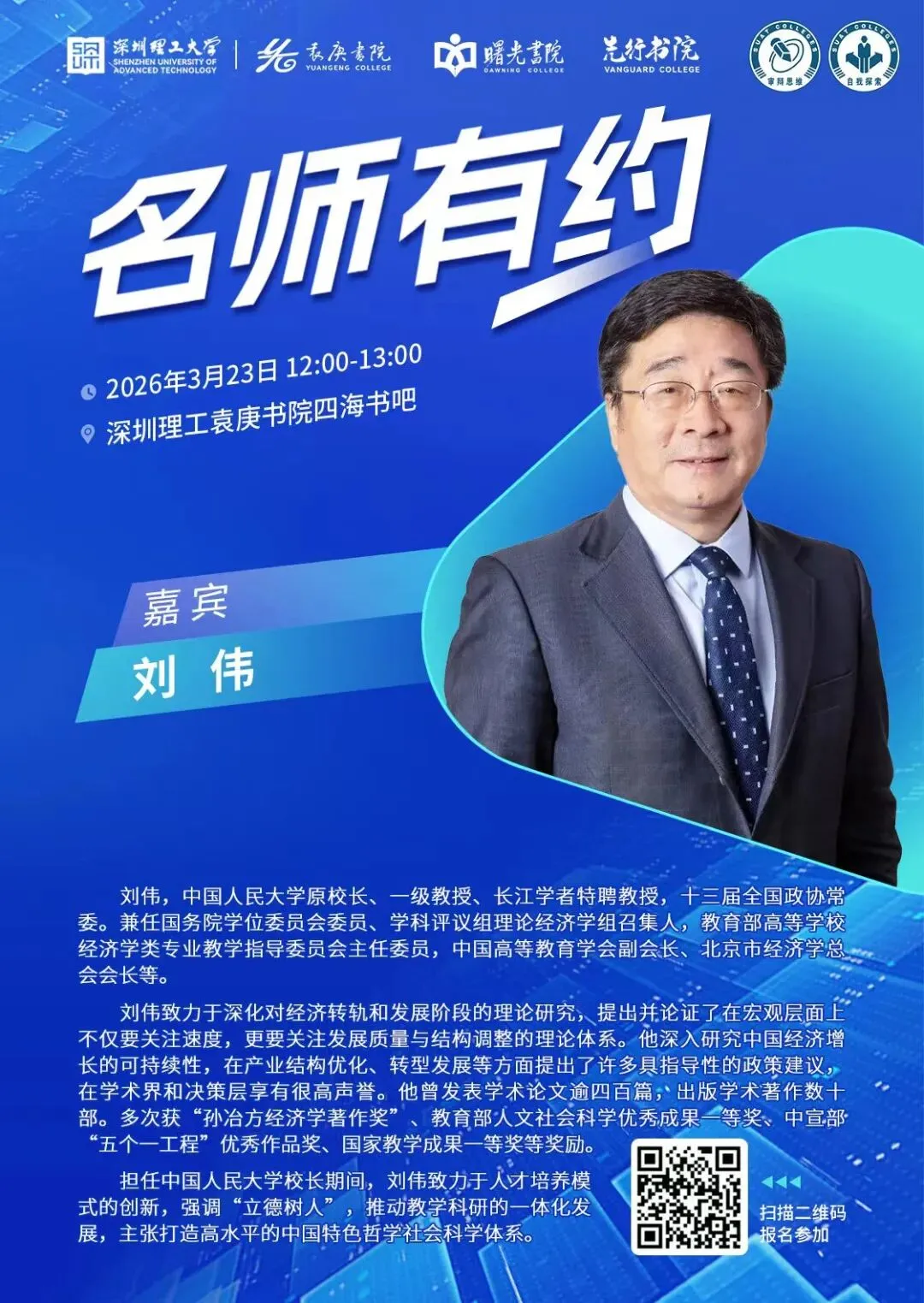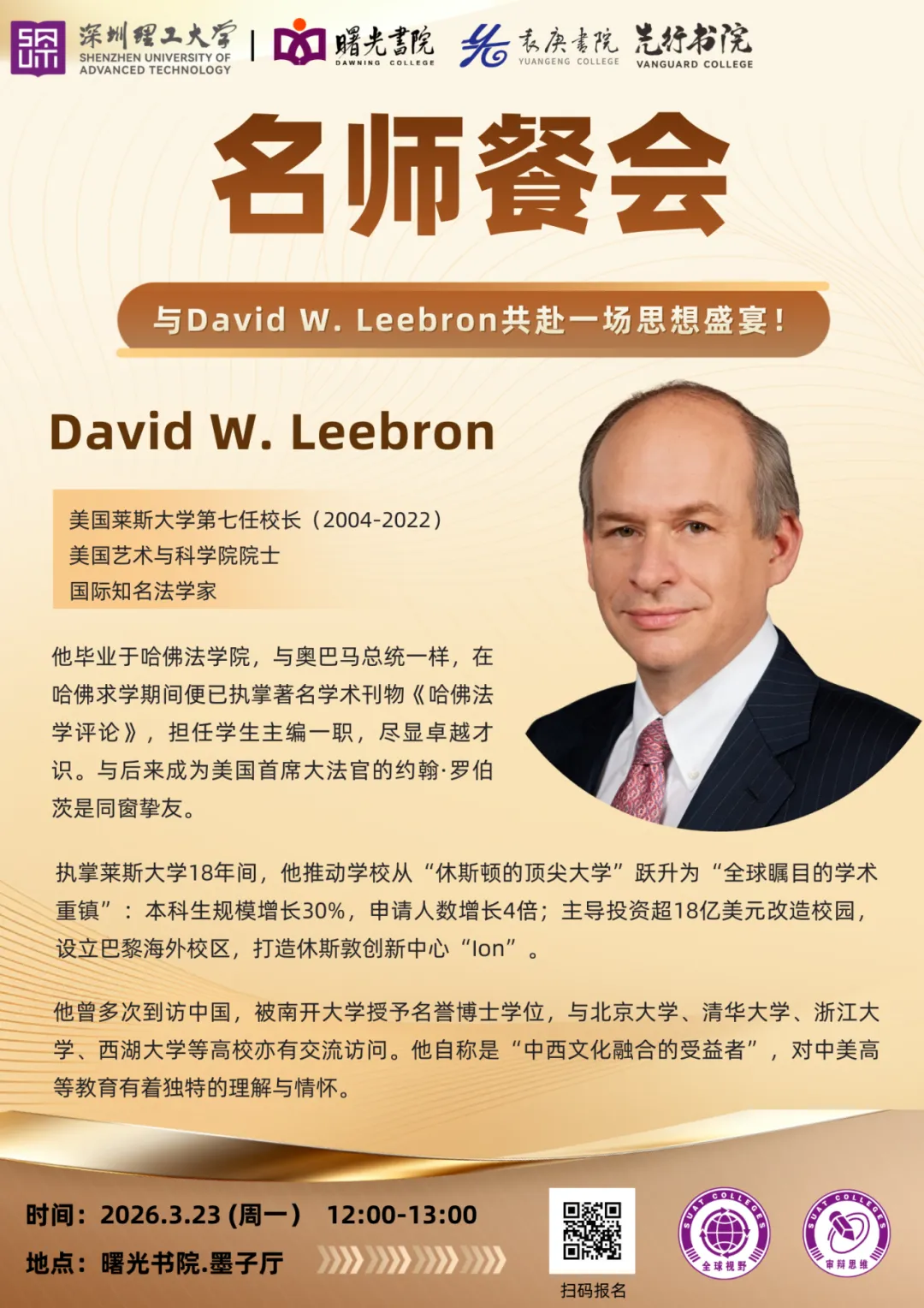 3月23日中午12点,深圳理工大学三大书院将迎来五位重磅嘉宾,前全国政协副主席和四大名校校长联袂登场,他们分别是:第十一届全国政协副主席、中国科学院院士王志珍、美国莱斯大学原校长David W. Leebron、北京大学原校长林建华、中国人民大学原校长刘伟、中山大学原校长黄达人,名师荟萃、星光熠熠。