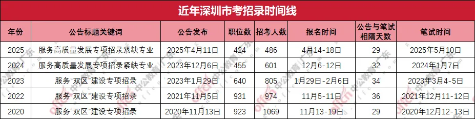 要推测“什么时候出公告”,就避不开参考和对比往年的时间线,小编整理了2022-2025年深圳市考的考试时间线,如下: