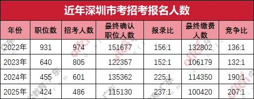 从近5年数据看,深圳市考正在经历 “招录缩减、竞争加剧” 的双重压力——2025年平均207人抢1个岗位,最热岗位接近3000:1!