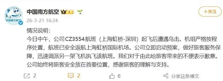 今日中午,公司CZ3554航班(上海虹桥-深圳)起飞后遭遇鸟击。机组严格按程序处置,航班已安全返航上海虹桥国际机场。公司立即启动预案,做好旅客服务保障,迅速调派另一架飞机执飞该航班。我们对于由此给旅客带来的不便表示歉意。公司始终将旅客安全放在首要位置,感谢旅客的理解与支持。