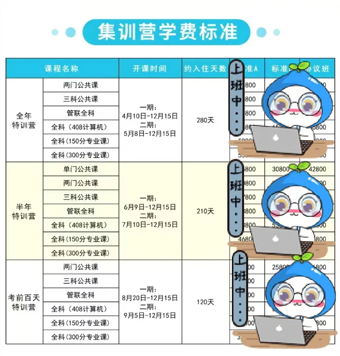 二战集训营按照培训时间以及科目进行收费,开设全年集训营、半年集训营、百天集训营;单科集训、全科集训等。