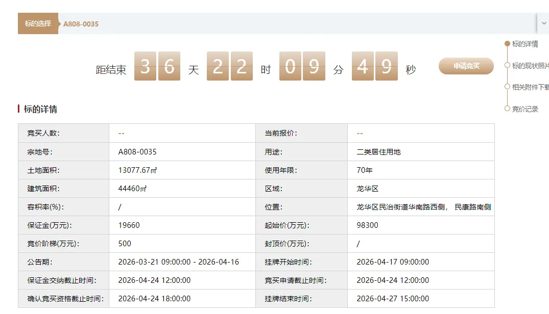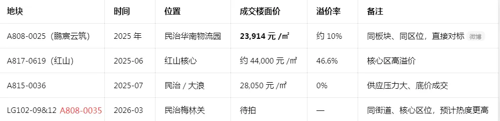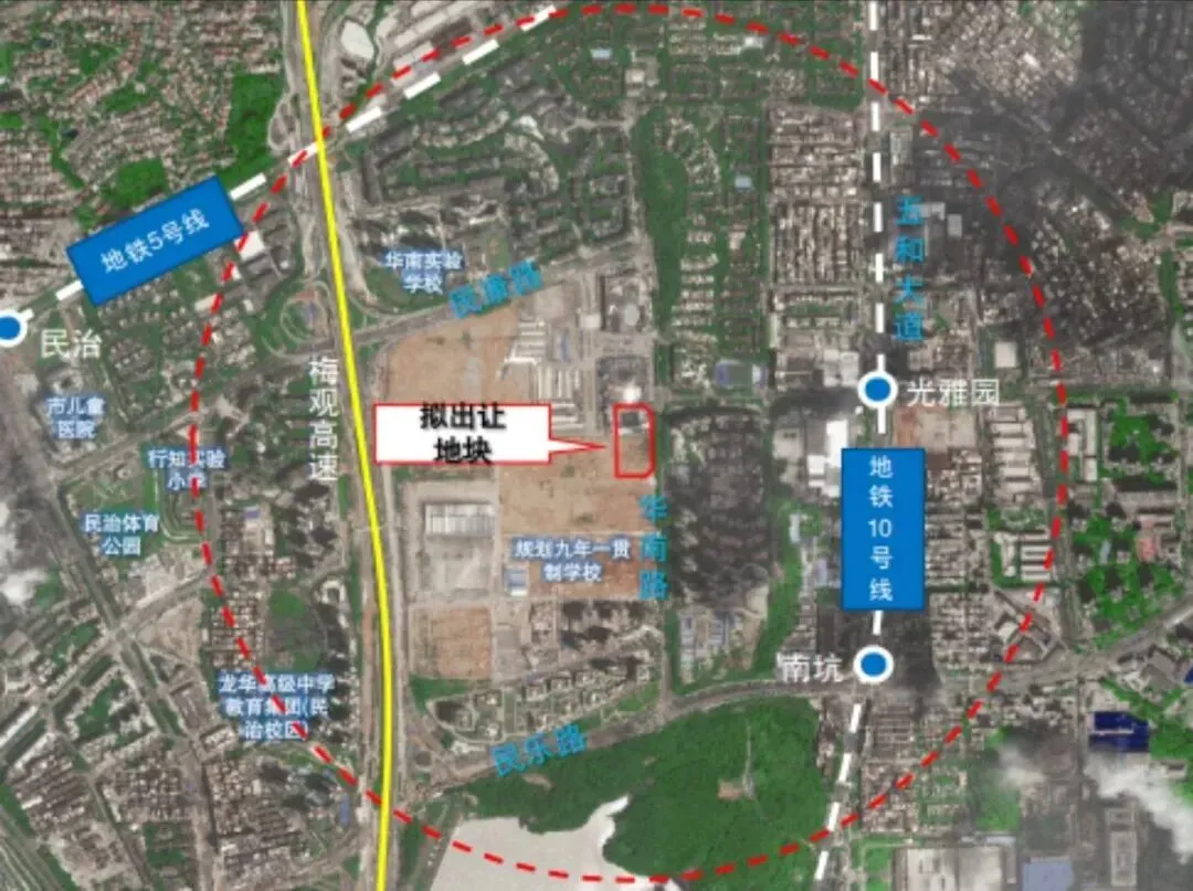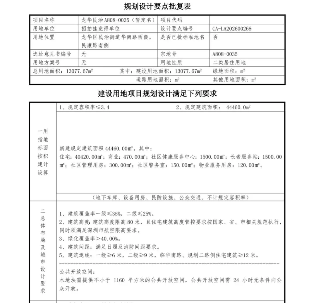 深圳住宅土拍开门红地块它来了,该地块位于龙华民治。该地块是3月18日上午在2026年深圳市首批居住用地推介会中上架的LG102-09&12地块,这也是深圳今年挂牌的第二宗住宅地块。也是我上篇压箱好货地块的五块地之一,感兴趣移步了解。4月27日结束拍卖,倒计时36天,起拍价9.83亿,对应楼面价2.4万。而鹏宸云筑项目对应的土地宗地号为A808-0025,其拍地价格如下:总成交价:51.79亿元,计容约21.66万平方米,楼面价:约23,914元/㎡。这次地块A808-0035按4.4万平米建面算,起拍价2.2万,除非底价成交这次推出的是民治A808-0035地块,A808-0035宗地位于龙华区民治街道华南路西侧、民康路南侧,用地性质为二类居住用地,土地面积13077.67㎡,建筑面积44460㎡,容积率3.4,土地年限70年,起始价98300万元。具体链接:https://td.szexgrp.com/jyfw/landOre.html?packageId=c88d79d37369485ab9fbdfee570063f1&mode=%E6%8C%82%E7%89%8C&landNo=A808-0035本公告出让宗地包含:住宅40420㎡、商业470㎡,允许分割转让;物业服务用房120㎡,产权归全体业主共有,不得转让;社区健康服务中心1500㎡、长者服务站1500㎡、社区管理用房300㎡、社区警务室150㎡,由竞得人建成后无偿移交政府。本公告出让宗地需提供不小于1160㎡的公共开放空间还是配了一些基本的公配,但是项目是纯粹的商品房 跟鹏宸云筑是一样的。A808-0035地块作为华南物流园整体升级的重要项目之一,将为深圳大量类似的旧工业区、旧仓储区改造为产城融合新城区。第一个地块是中建鹏宸云筑。2月4日上午,龙华区人民政府与深圳市人民政府口岸办公室(以下简称“市口岸办”)在深圳市口岸办举行《龙华区范围内原二线关移交合作备忘录》签约仪式。此次签约标志着龙华区范围内原二线关片区土地管理权正式移交龙华区要注意的是交通瓶颈是制约梅林关发展的首要难题,“英雄难过梅林关”曾是片区交通拥堵的真实写照。为从根本上摆脱这一困境,片区正在推进梅观大道半下沉改造工程,打造“主线下沉+辅道集散”的复合通道。其中规划主线双向8车道+辅道双向8车道,预计改造完成后整体通行效率可提升10%以上。