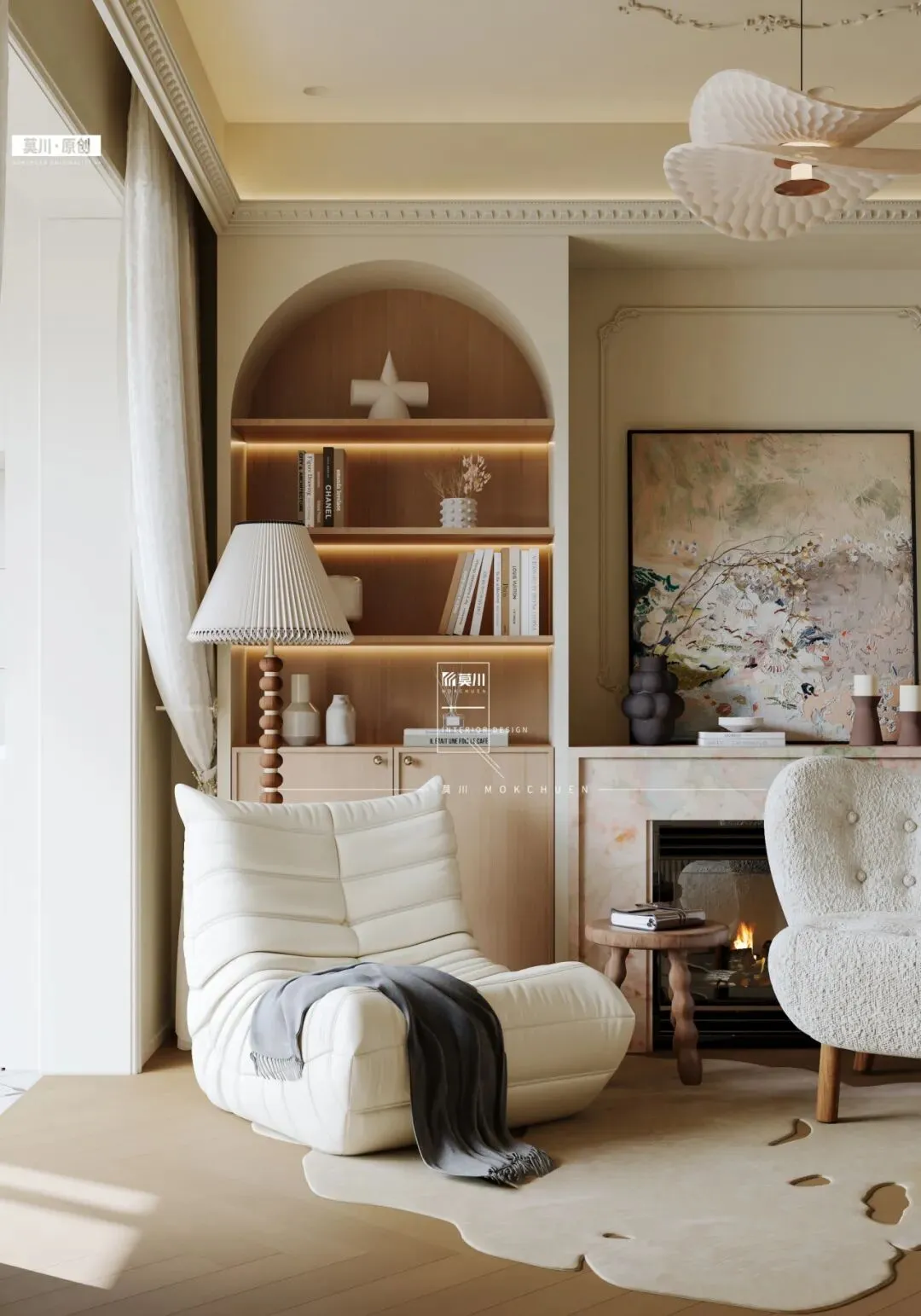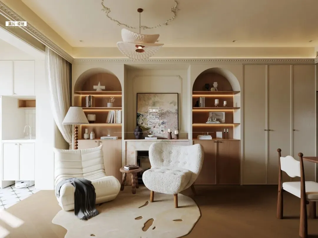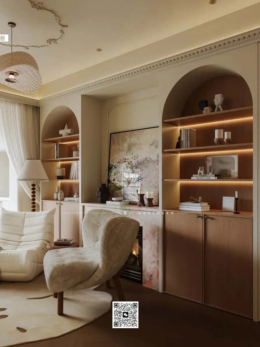 设计核心是以壁炉取代电视,成为空间的视觉与情感中心。温润的奶油色壁炉两侧,对称设计了两座优雅的拱形开放式柜子,以经典法式线条勾勒出仪式感,内部陈列的书籍与器物成为最生动的装饰。