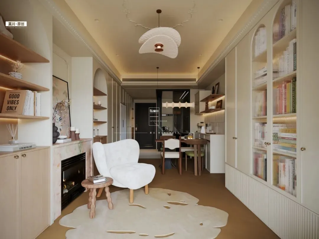 客厅另一侧则整合为一整面简洁的白色收纳墙,提供强大的储物功能,其干净的立面与对面的拱形书柜形成“繁”与“简”、“展示”与“收纳”的巧妙平衡。最终,这个去客厅化的“家庭核心厅”在壁炉的暖意、书卷的香气与慵懒单椅的环绕中,完美诠释了兼具文化感与治愈力的理想生活场景。