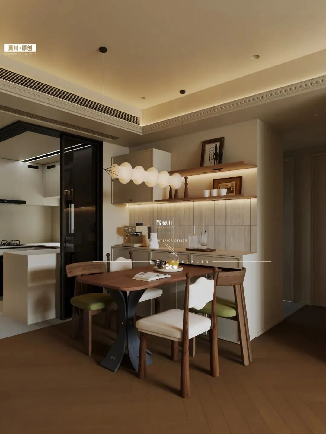 餐厅区域,一张温润的原木餐桌成为视觉焦点,其天然纹理与亲切触感,奠定了用餐区的温暖氛围。一侧墙面打造了米白色餐边柜,柜体线条简约利落,提供强大的收纳与展示功能,同时作为空间的“留白”背景,凸显材质的纯净与对比。