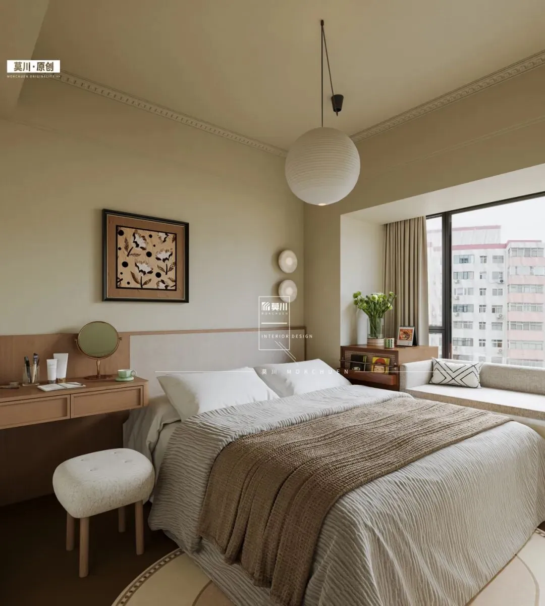 床的左侧,设置了线条简约的梳妆区。一盏手工褶皱的纸质圆球吊灯悬垂而下,其柔和漫射的光线与不规则的手工痕迹,成为空间中的诗意焦点,完美诠释了侘寂风对不完美之美的欣赏。